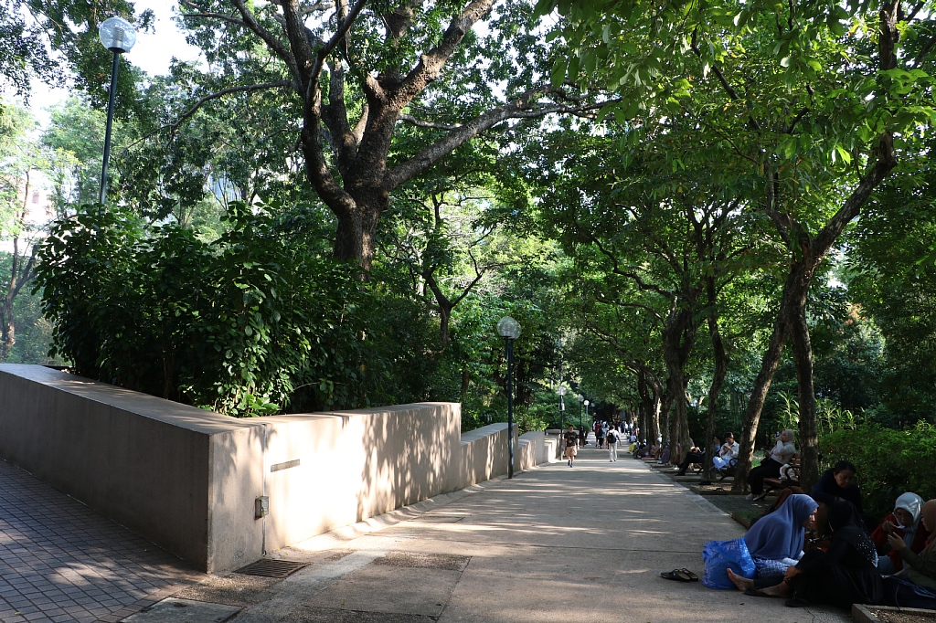 南側から公園に入るとこんな感じで広々&多数の木々が。ちょうど週末だったので住み込みの家政婦さん?が寛いでいる場面も多かったかと。